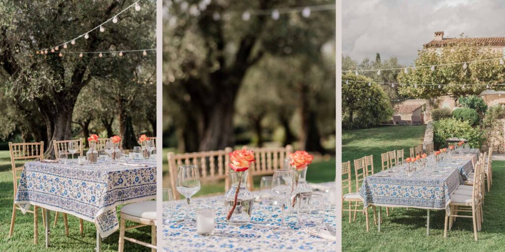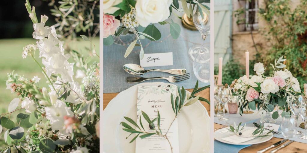 • Incorporate local elements, such as fresh seasonal flowers, Provence olive branches, or small bottles of olive oil as gifts. Remember, your venue sets the tone, so let it inspire your table design.