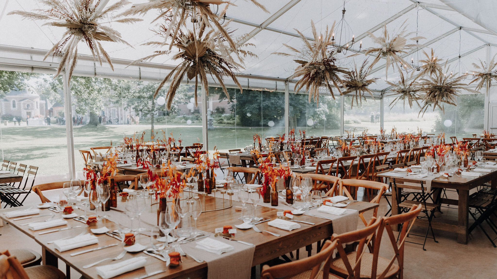 • Banquet tables create a communal atmosphere, perfect for grand chateaus or large marquees.