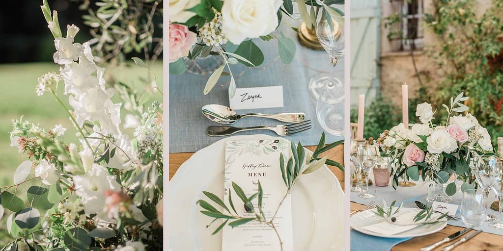 - Incorporate local elements, such as fresh seasonal flowers, Provence olive branches, or small bottles of olive oil as gifts. Remember, your venue sets the tone, so let it inspire your table design.