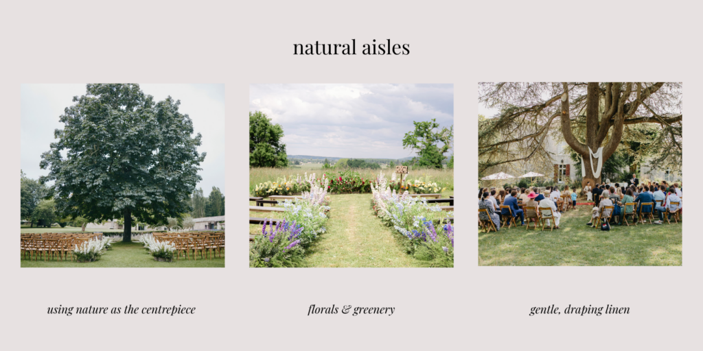 Chateau Bee’s insider tip: let nature be the centrepiece for your ceremony aisle. Many of our selected chateaux have beautiful natural spaces, our advice is to use them! From century old trees, to glistening lakes and lush vineyards, they all can provide a beautiful setting, with no extra materials or decor needed!
