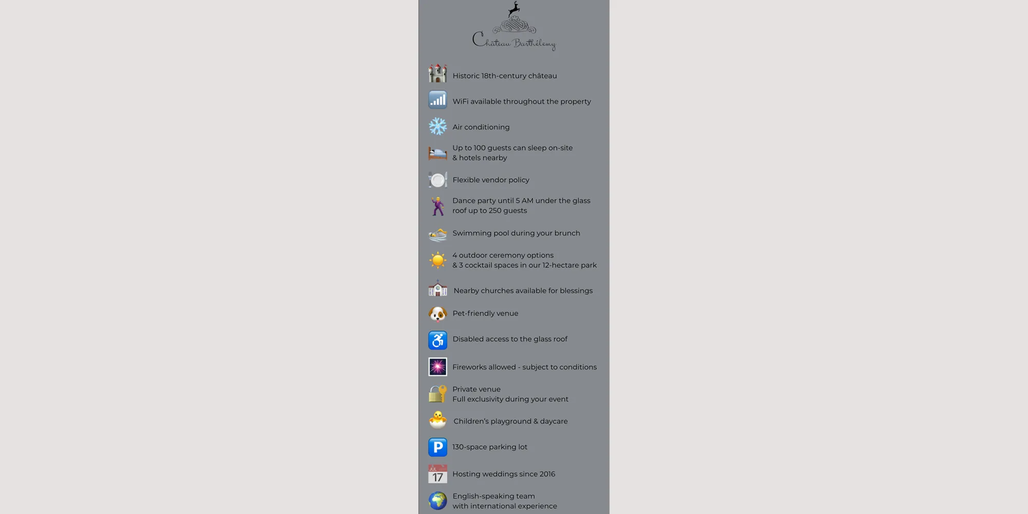 We want to express our deep gratitude to the entire team at Château Barthélemy. Thanks to them, we had the immense privilege of celebrating our wedding in a place full of charm and kindness. Every team member, along with the exceptional setting, played a huge part in making our stay unforgettable. We had the chance to enjoy this place for 48 hours, surrounded by our family and friends, it was simply magnificent. (There is plenty of accommodation for guests.) The communication before and during the event, the attention to detail, the impeccable service, flawless cleanliness, flexibility, and recommended vendors, everything was thought through down to the smallest detail. We warmly recommend Château Barthélemy and hope to return one day as guests this time.