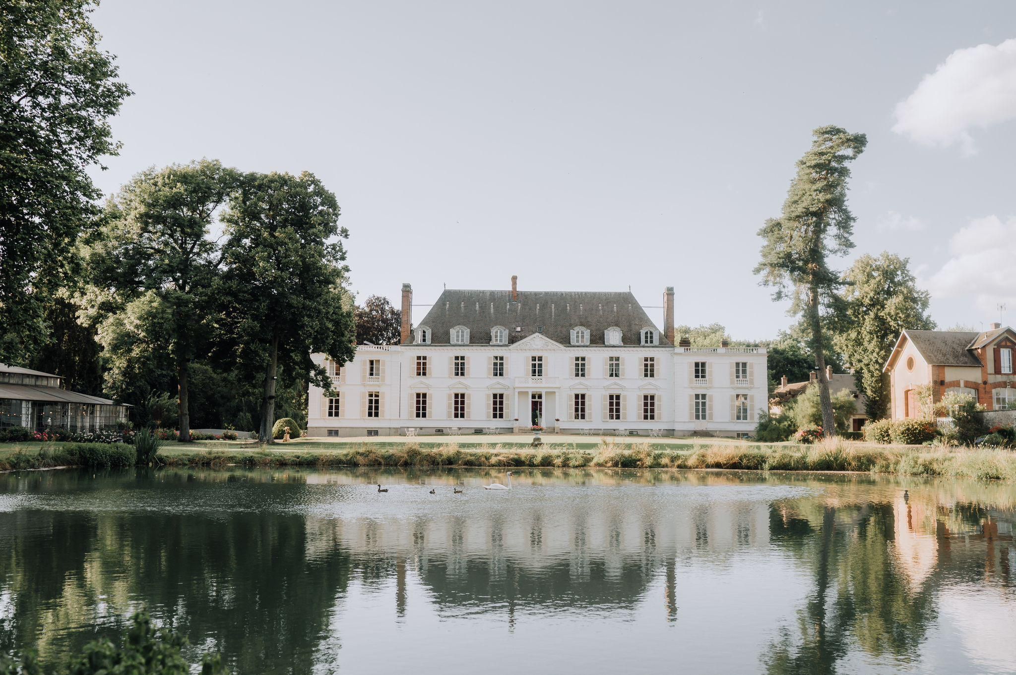 "Chateau Barthélemy, with its romantic lake, vast grounds, and glass-roofed reception space, is a magical spot for a countryside wedding near Paris."