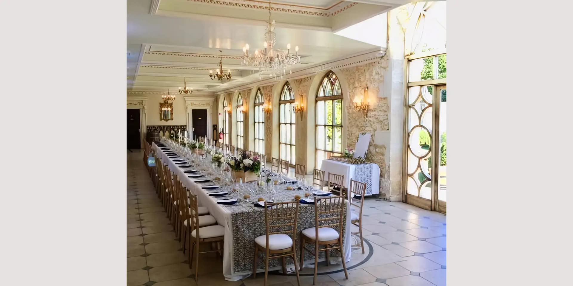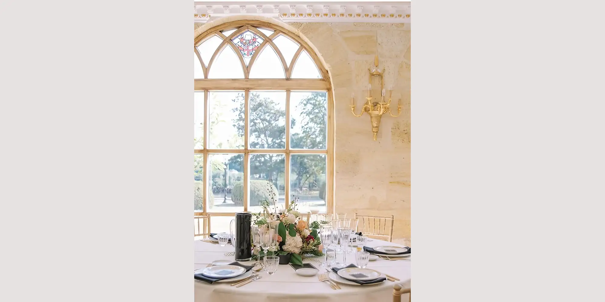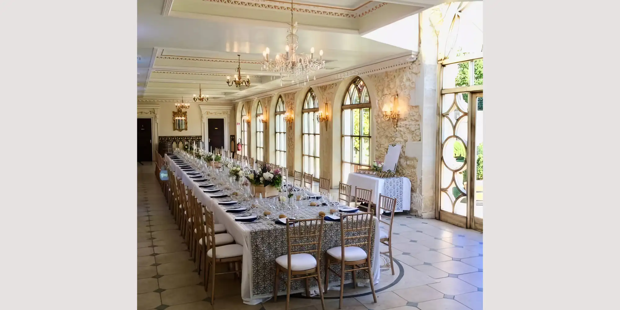 Your ceremony can unfold at the edge of the vineyards, framed by the rows of grapes that have shaped this landscape for generations. After the “I dos,” guests can enjoy a relaxed cocktail on the lawn before moving to the Orangerie for dinner. This 12th and 17th-century space is truly gorgeous – filled with natural light, chandeliers and tall windows. Opening directly onto the gardens, it can host up to 180 guests.