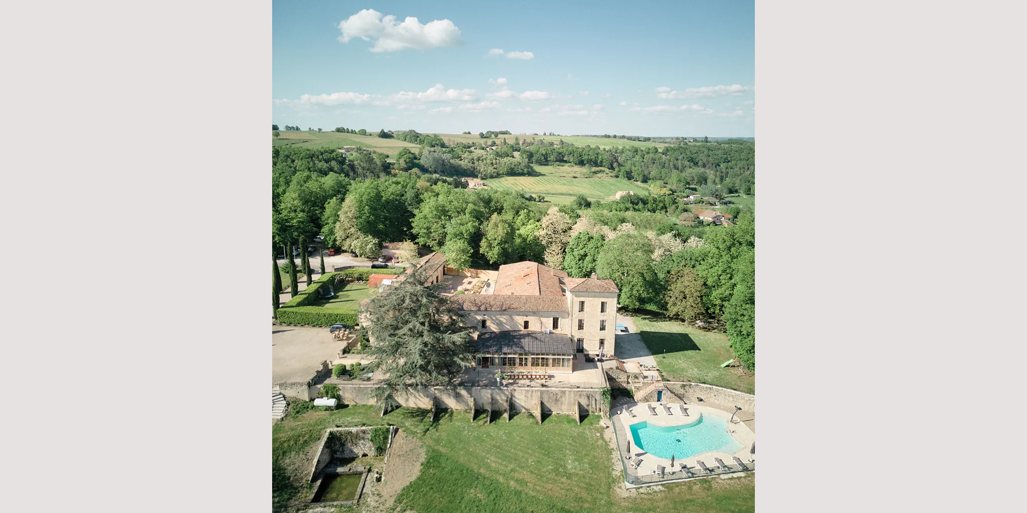 Chateau de Sanse, located near the renowned village of St Emilion, is a charming chateau hotel nestled amidst serene vineyards, offering picturesque views over the French countryside. It serves as an enchanting wedding venue near Bordeaux and the Dordogne region.