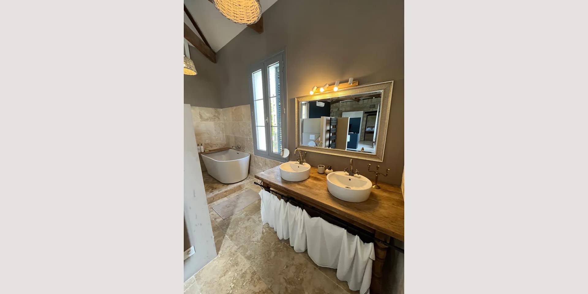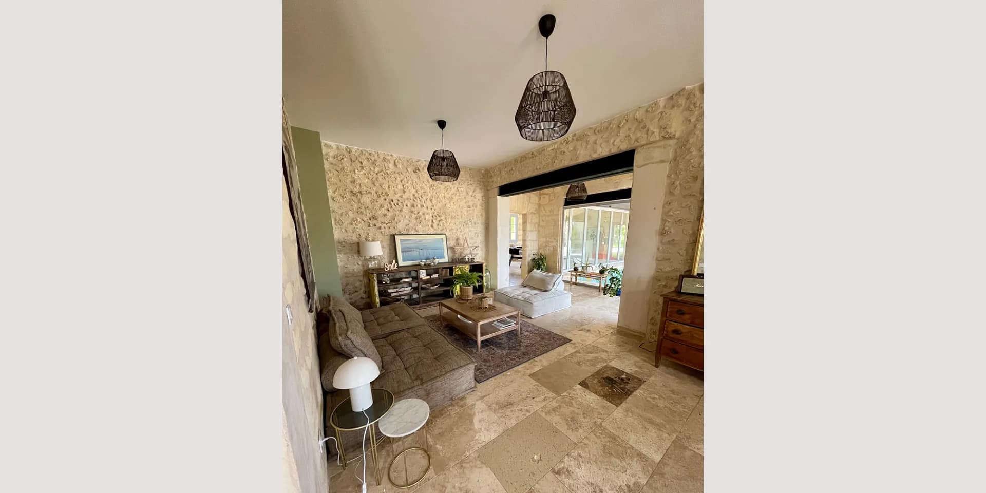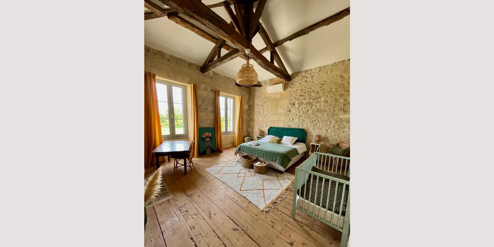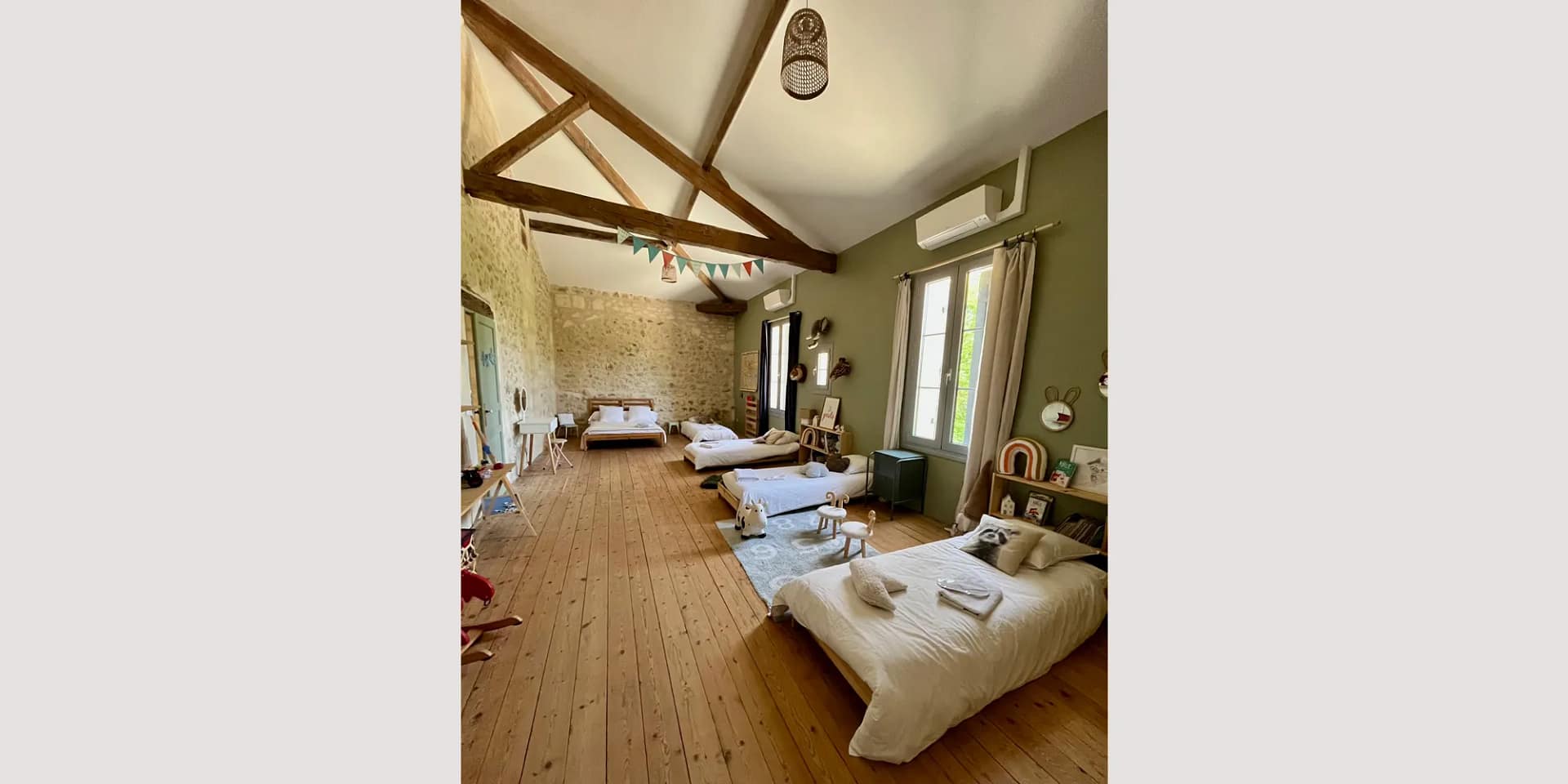 The estate sleeps up to 38 guests across two beautifully renovated houses, a guest cottage, a playful children’s dormitory and unique nature lodgings including a treehouse and tipi tents. In the bedrooms, stone walls, exposed beams and private bathrooms create comfort with plenty of character.