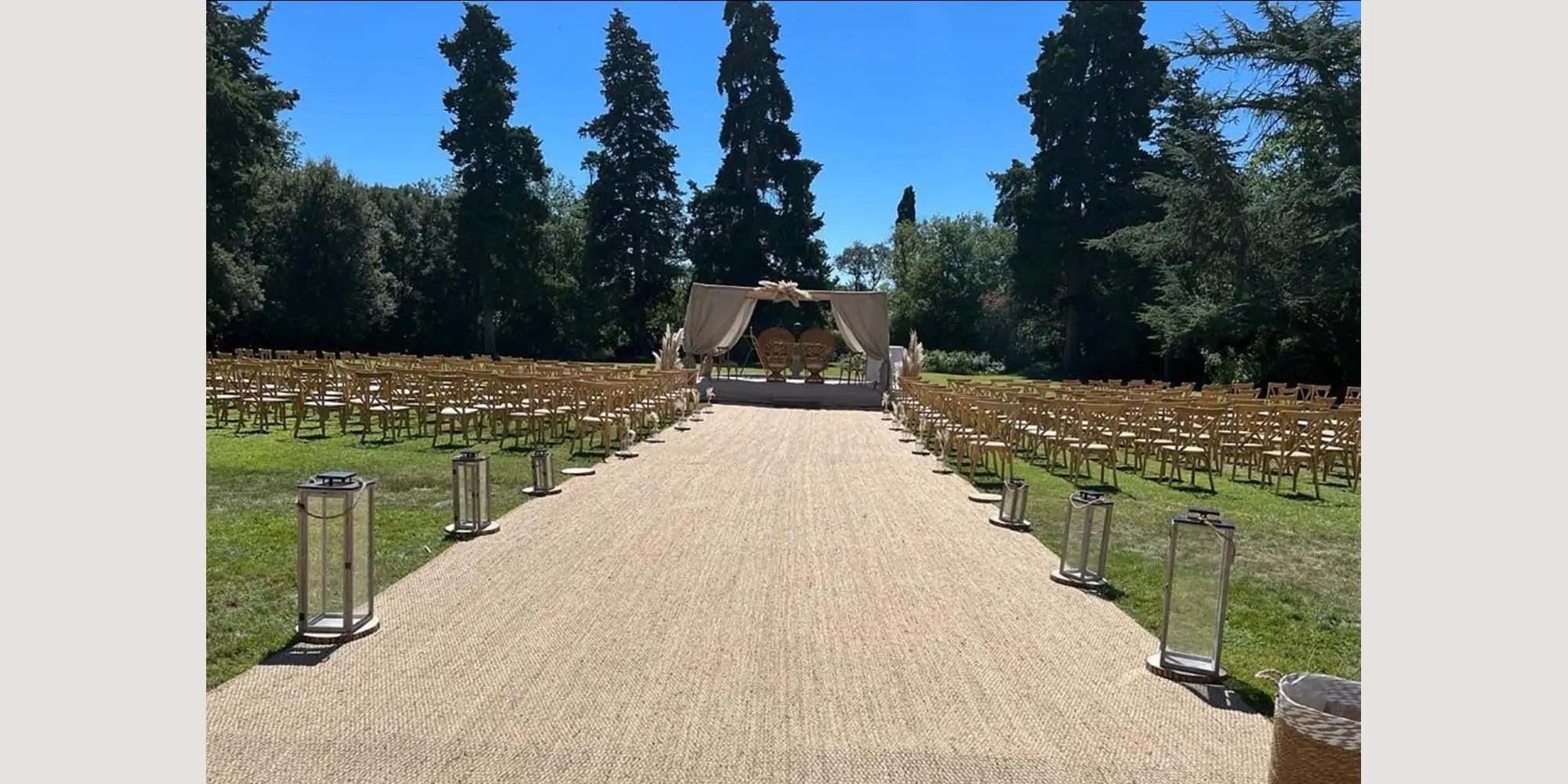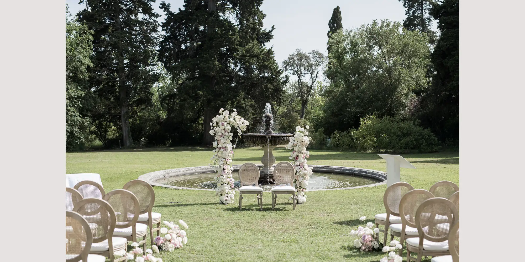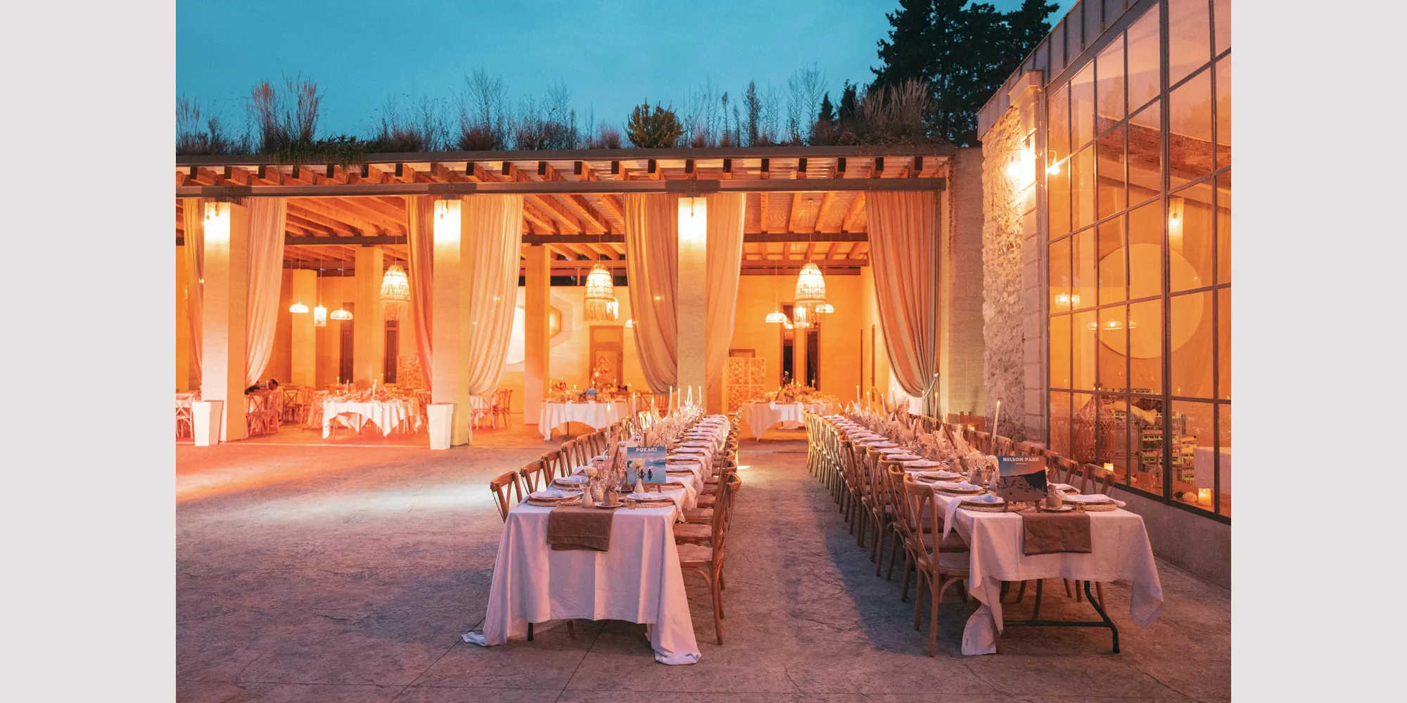 The ceremony will typically take place in the shade of the park’s tall trees, facing the beautiful ochre façade with its pale blue shutters. For dinner, you will have three flexible options: Le Préau, a 200m² covered courtyard with adjoining terrace; La Serre, a light-filled 90m² space with stone walls and glass doors; or the elegant 300m² nomadic tent. Each space is stylish with a bohemian touch and can be used for both dining and dancing.