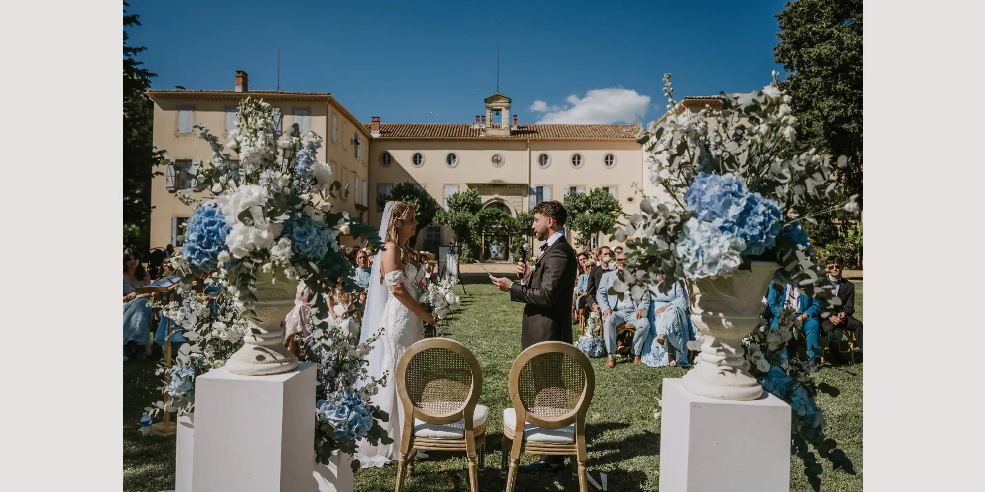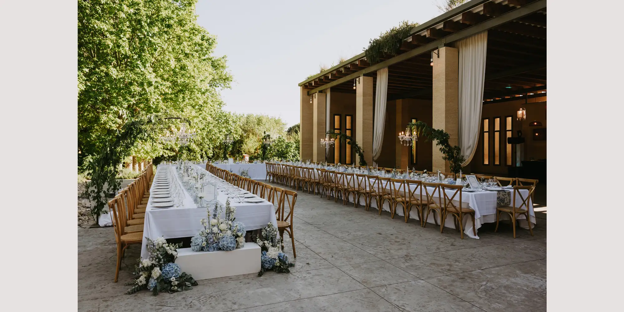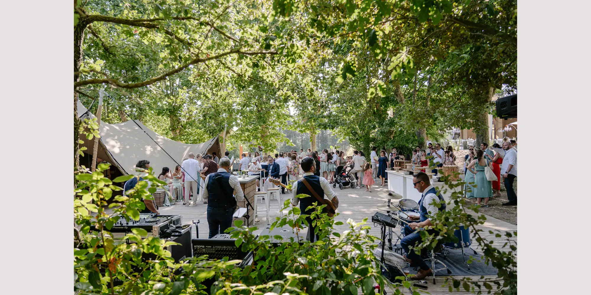 The ceremony will typically take place in the shade of the park’s tall trees, facing the beautiful ochre façade with its pale blue shutters. For dinner, you will have three flexible options: Le Préau, a 200m² covered courtyard with adjoining terrace; La Serre, a light-filled 90m² space with stone walls and glass doors; or the elegant 300m² nomadic tent. Each space is stylish with a bohemian touch and can be used for both dining and dancing.