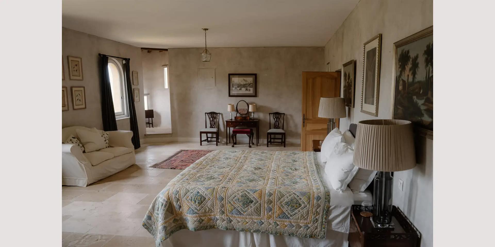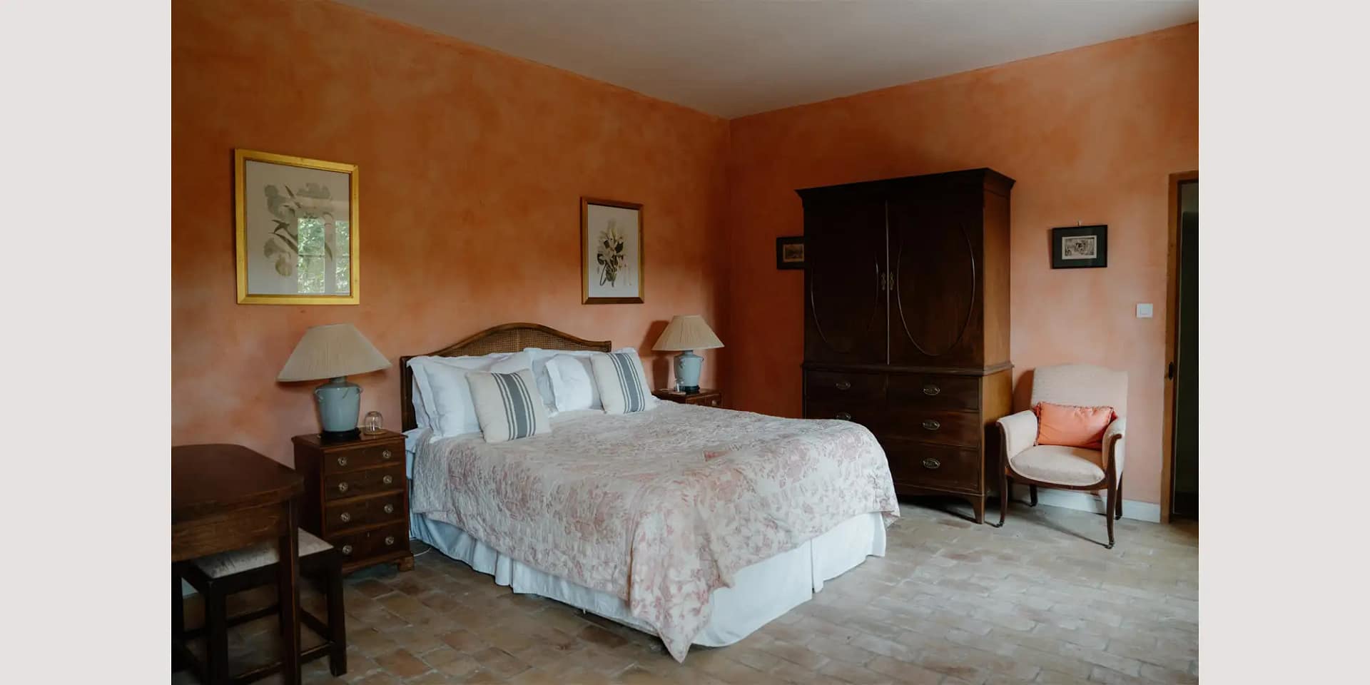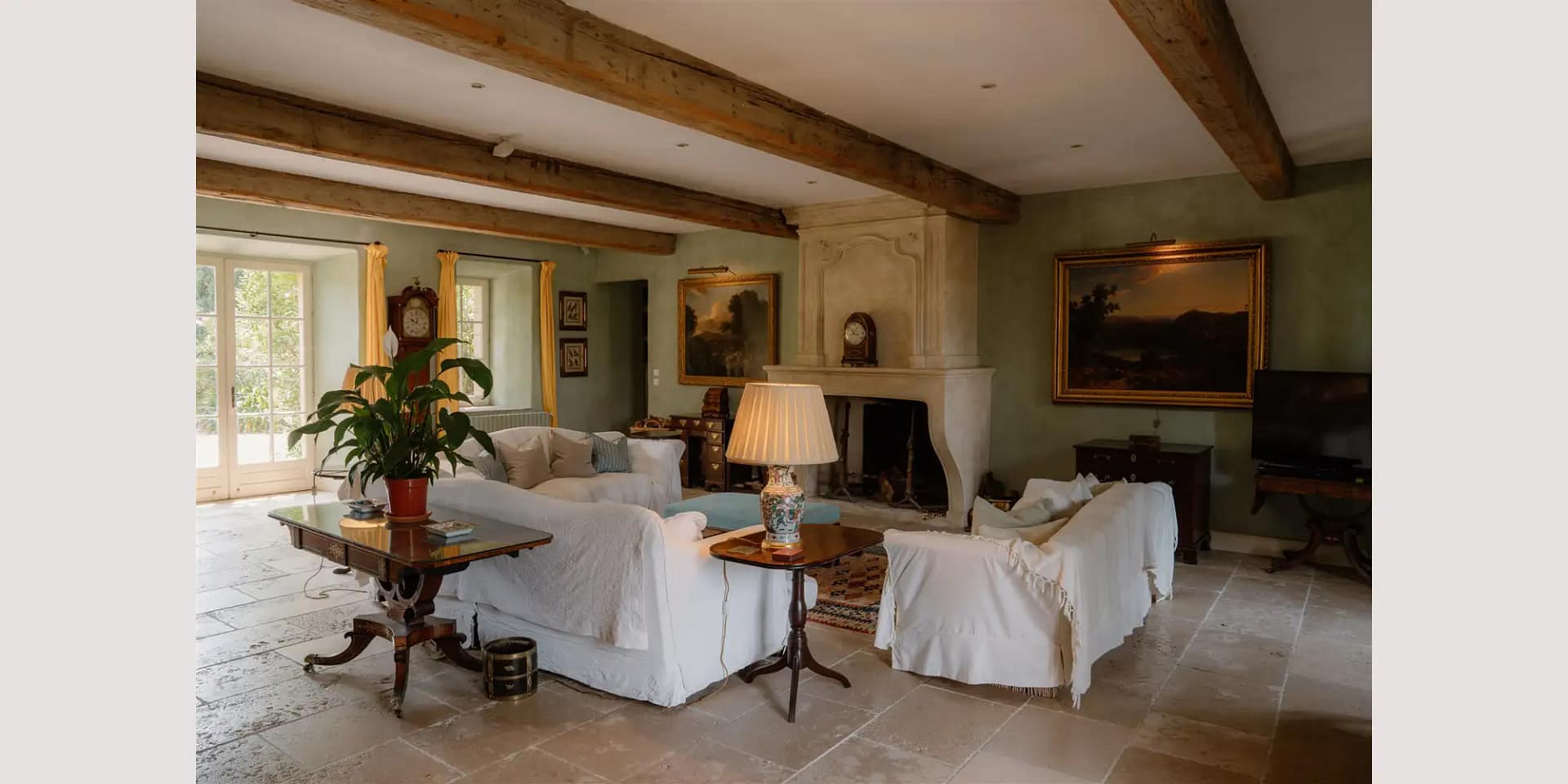 The main house and adjoining cottage accommodate up to 22 guests across eleven bedrooms and eight bathrooms. Interiors are a love letter to French country living, with flagstone floors, antique furniture, soft hues, and sunlight pouring through windows overlooking the hills. The house also features two drawing rooms, a large family dining room, and three fully equipped kitchens, including one with a professional Château Cornue cooker and a rustic stone fireplace that doubles as a barbecue.