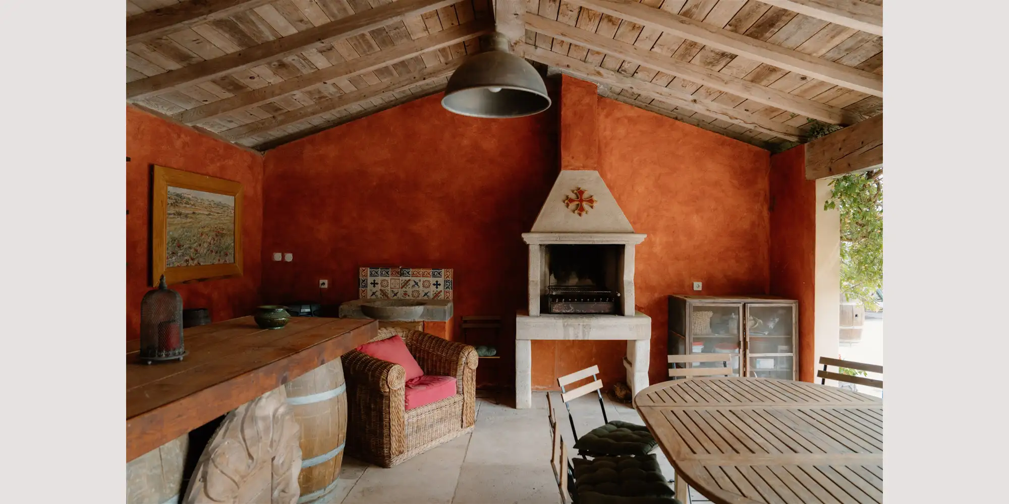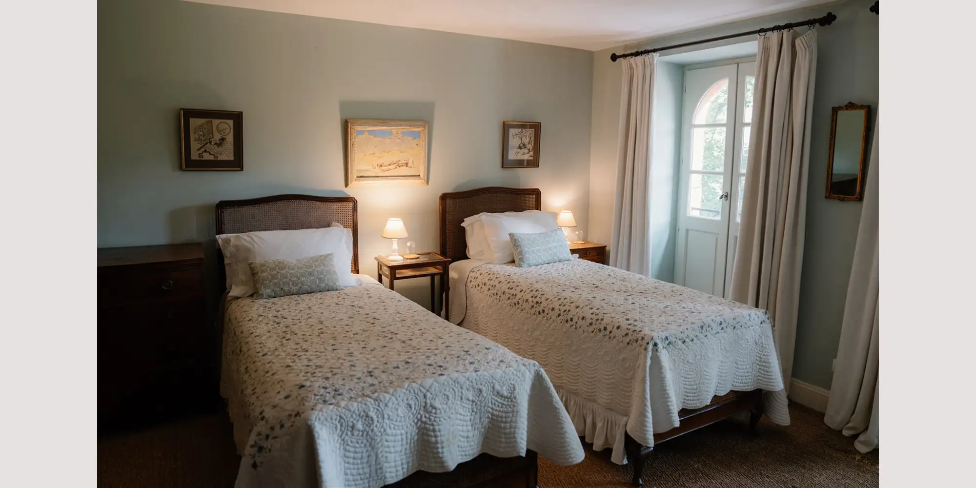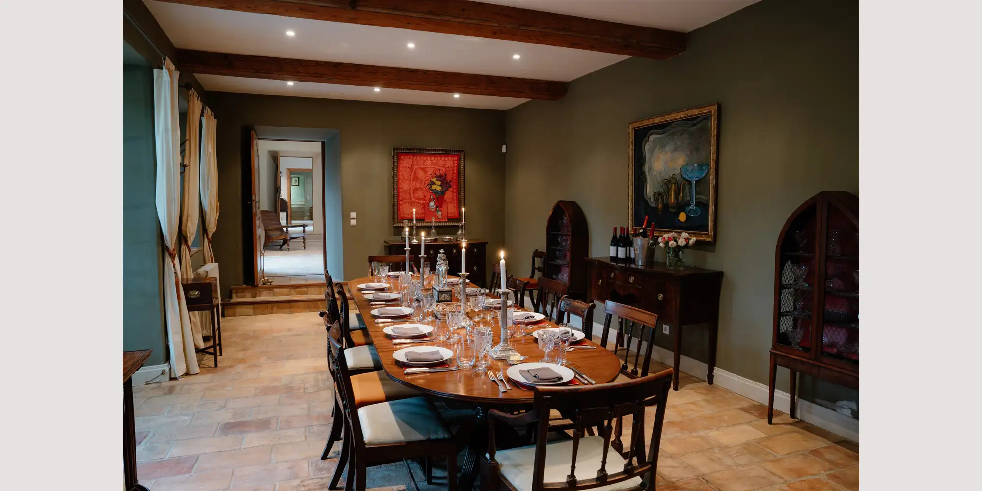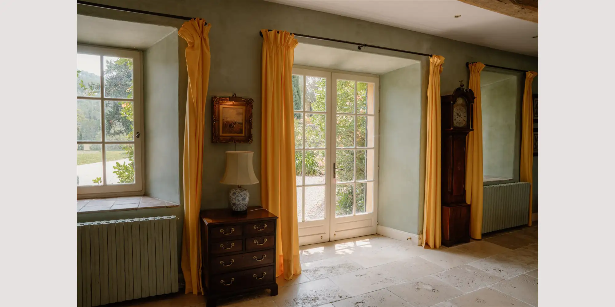The main house and adjoining cottage accommodate up to 22 guests across eleven bedrooms and eight bathrooms. Interiors are a love letter to French country living, with flagstone floors, antique furniture, soft hues, and sunlight pouring through windows overlooking the hills. The house also features two drawing rooms, a large family dining room, and three fully equipped kitchens, including one with a professional Château Cornue cooker and a rustic stone fireplace that doubles as a barbecue.
