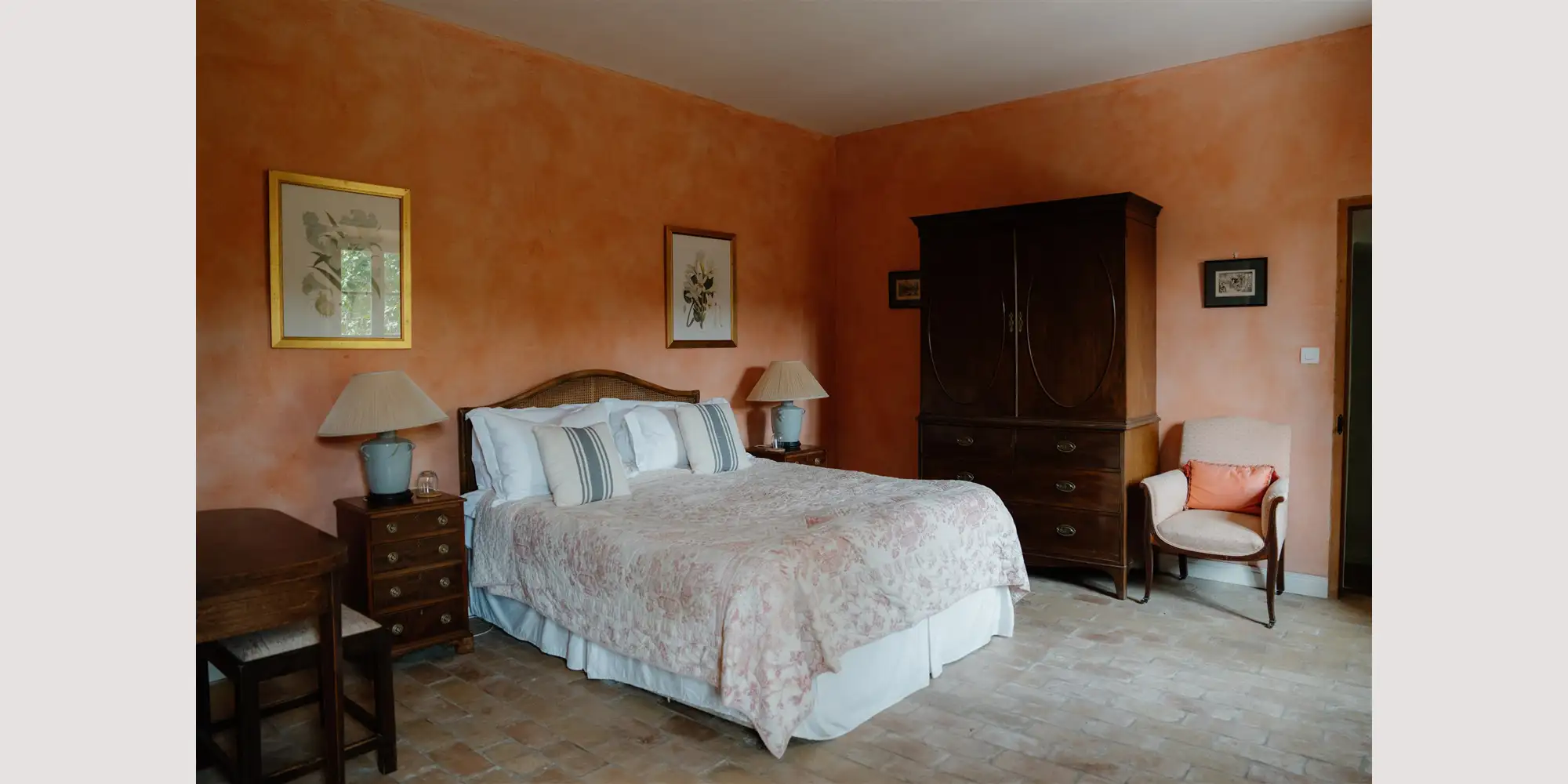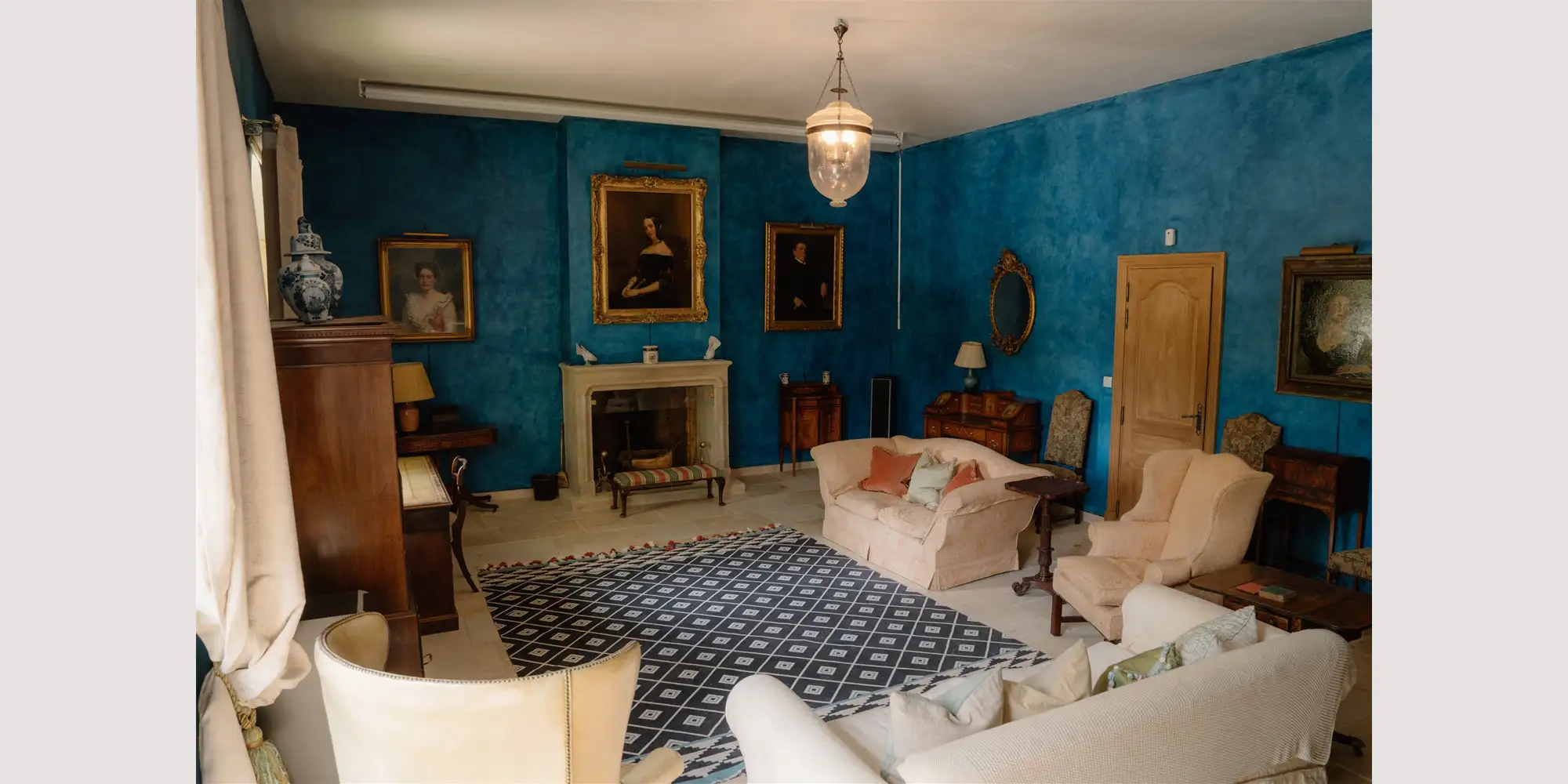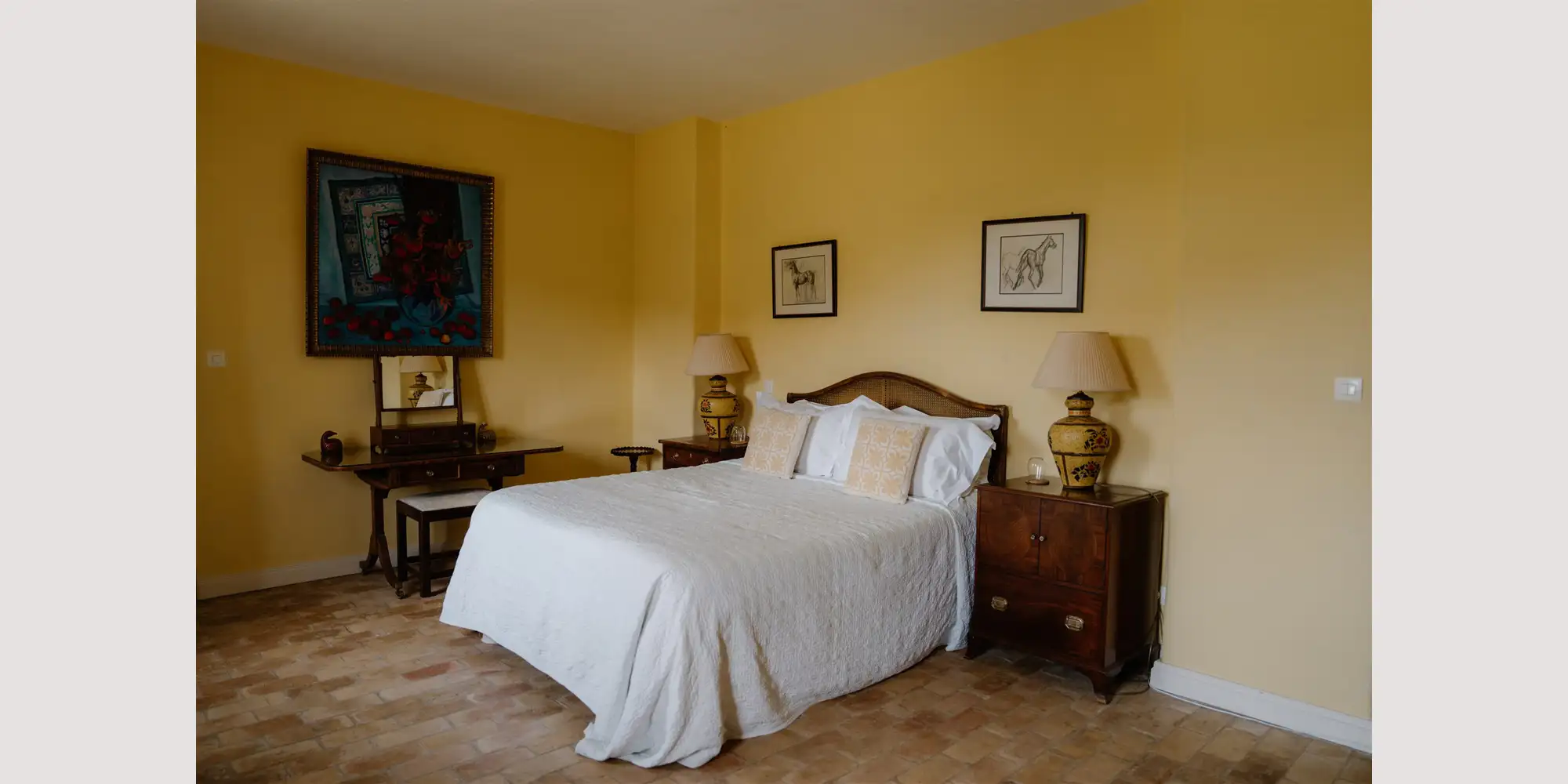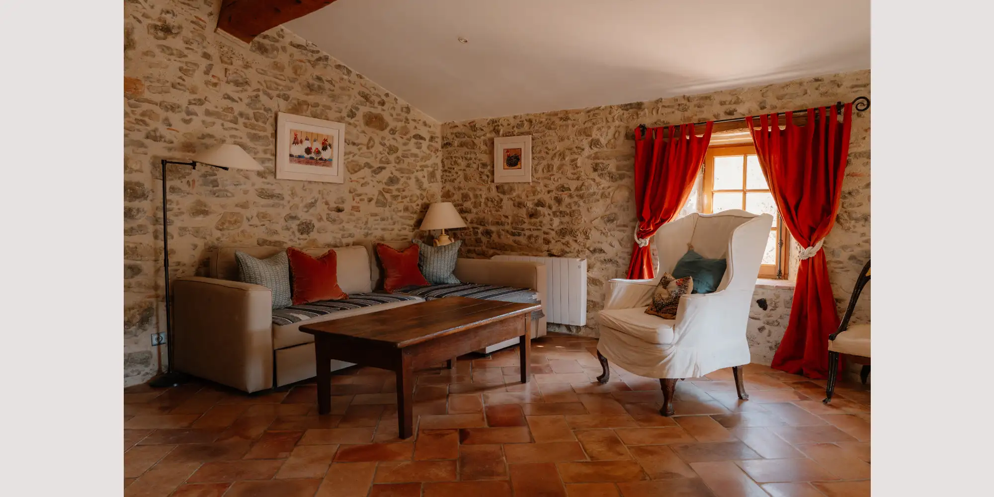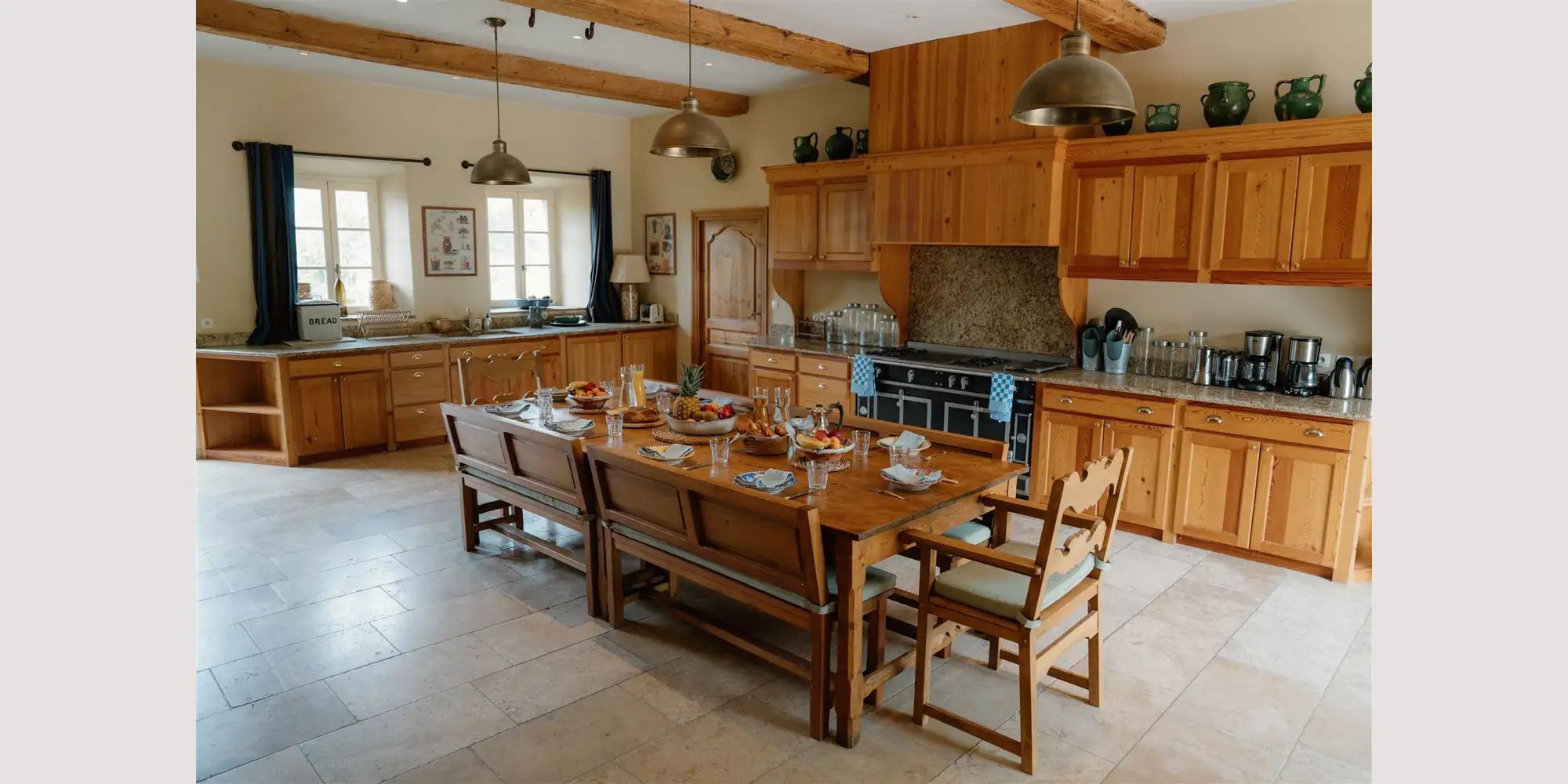 The main house and adjoining cottage accommodate up to 22 guests across eleven bedrooms and eight bathrooms. Interiors are a love letter to French country living, with flagstone floors, antique furniture, soft hues, and sunlight pouring through windows overlooking the hills. The house also features two drawing rooms, a large family dining room, and three fully equipped kitchens, including one with a professional Château Cornue cooker and a rustic stone fireplace that doubles as a barbecue.
