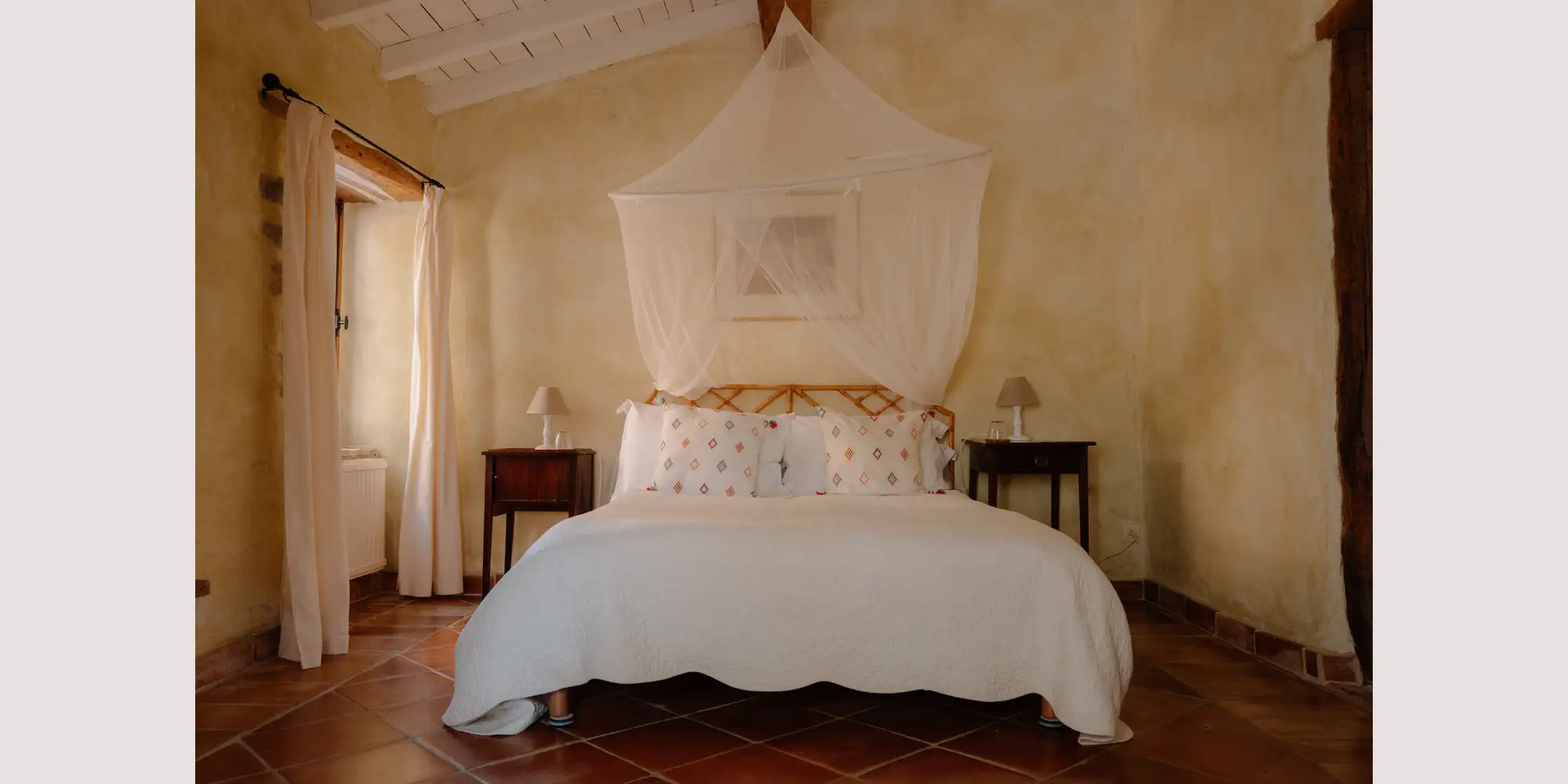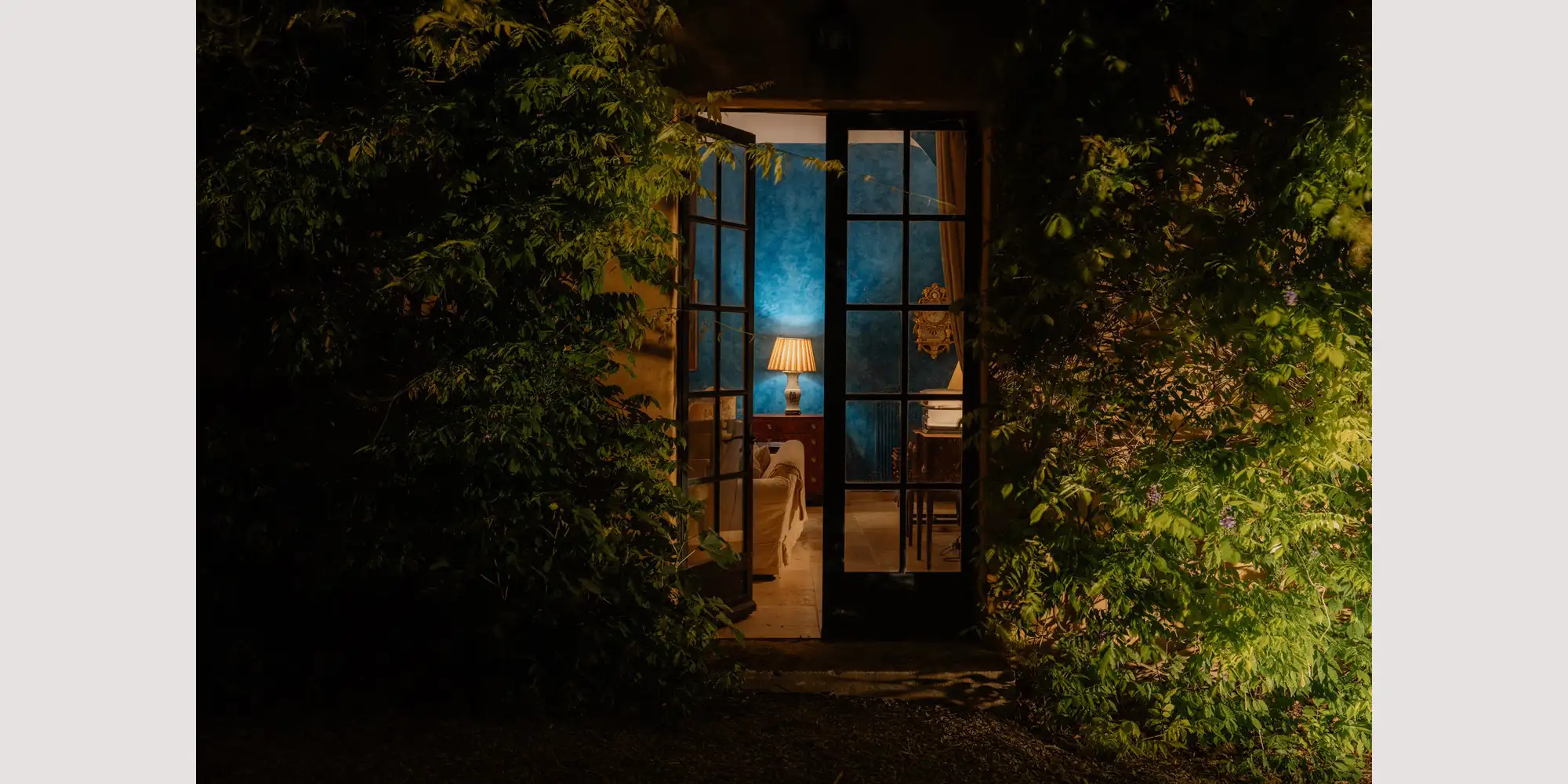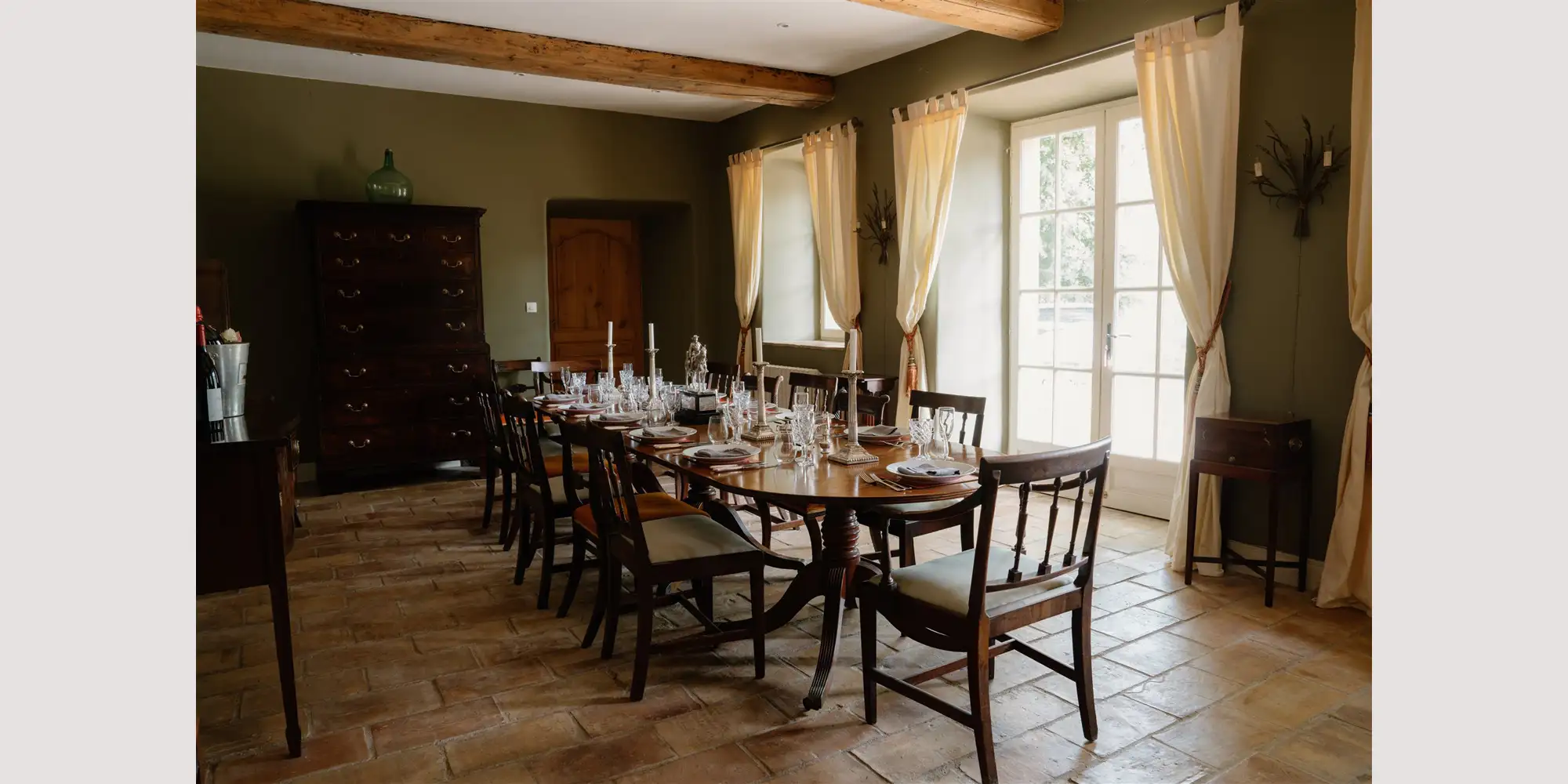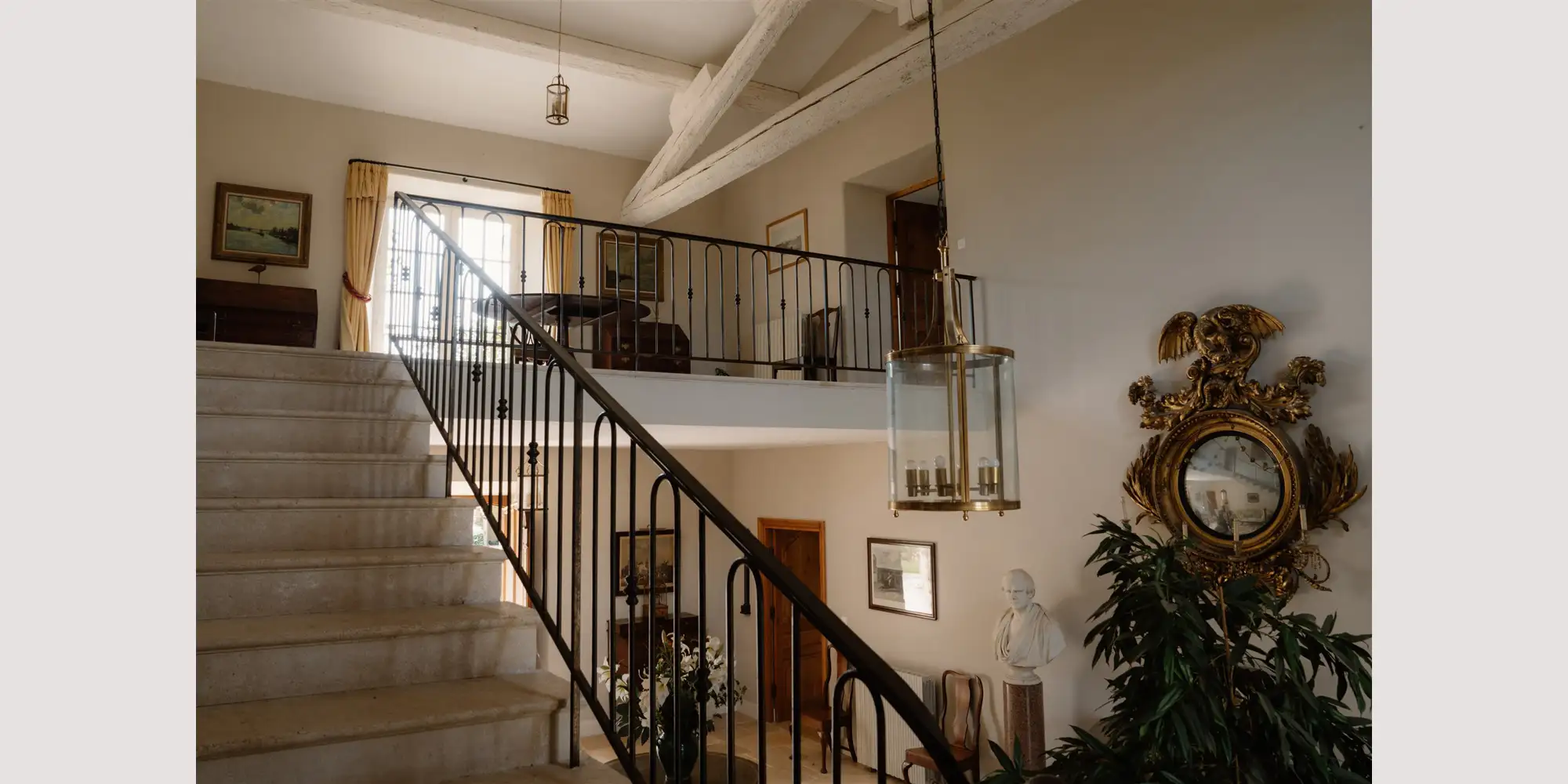 The main house and adjoining cottage accommodate up to 22 guests across eleven bedrooms and eight bathrooms. Interiors are a love letter to French country living, with flagstone floors, antique furniture, soft hues, and sunlight pouring through windows overlooking the hills. The house also features two drawing rooms, a large family dining room, and three fully equipped kitchens, including one with a professional Château Cornue cooker and a rustic stone fireplace that doubles as a barbecue.
